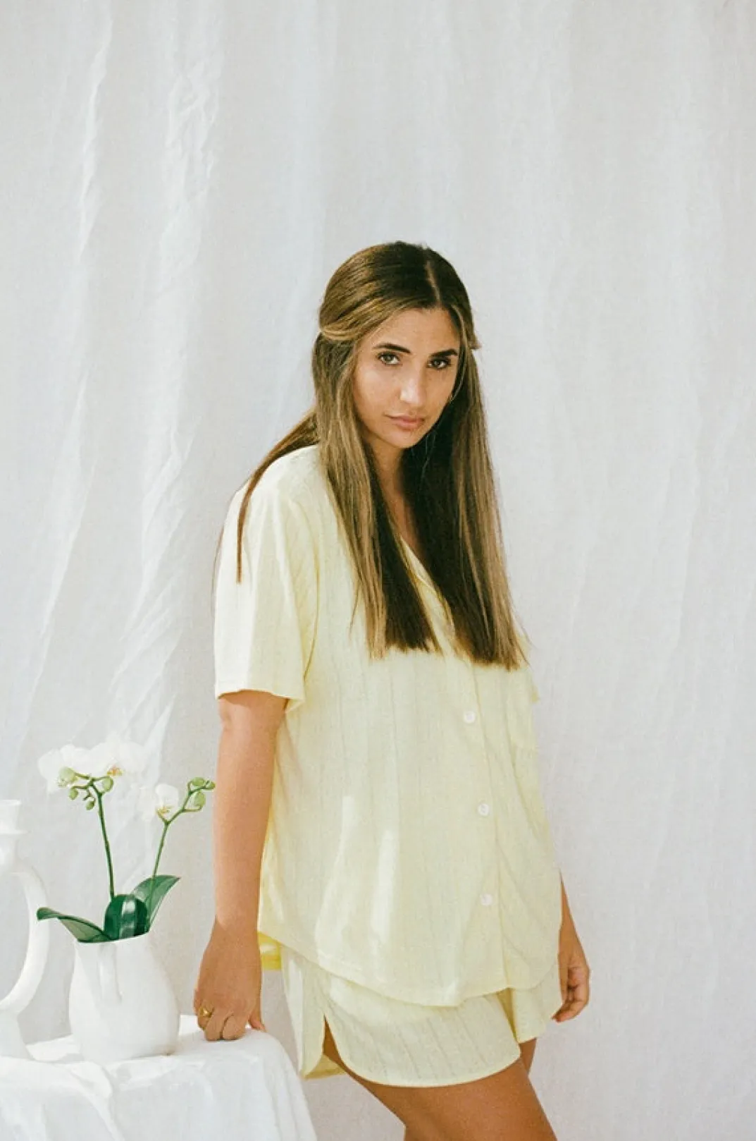 *This Is A Final Sale Item* Comfy And Super Cute! The Siesta Pj Shorts Are Made From A Super Soft Pointelle Jersey Fabric In A Soft Yellow Hue. They Feature An Elasticated Waist With Paperbag Detailing, Twin Pockets, Curved Hems And Slight Splits At Side. Pair With The Siesta Pj Top And Lemon Jersey Scrunchie! Designed Exclusively By Sabo.