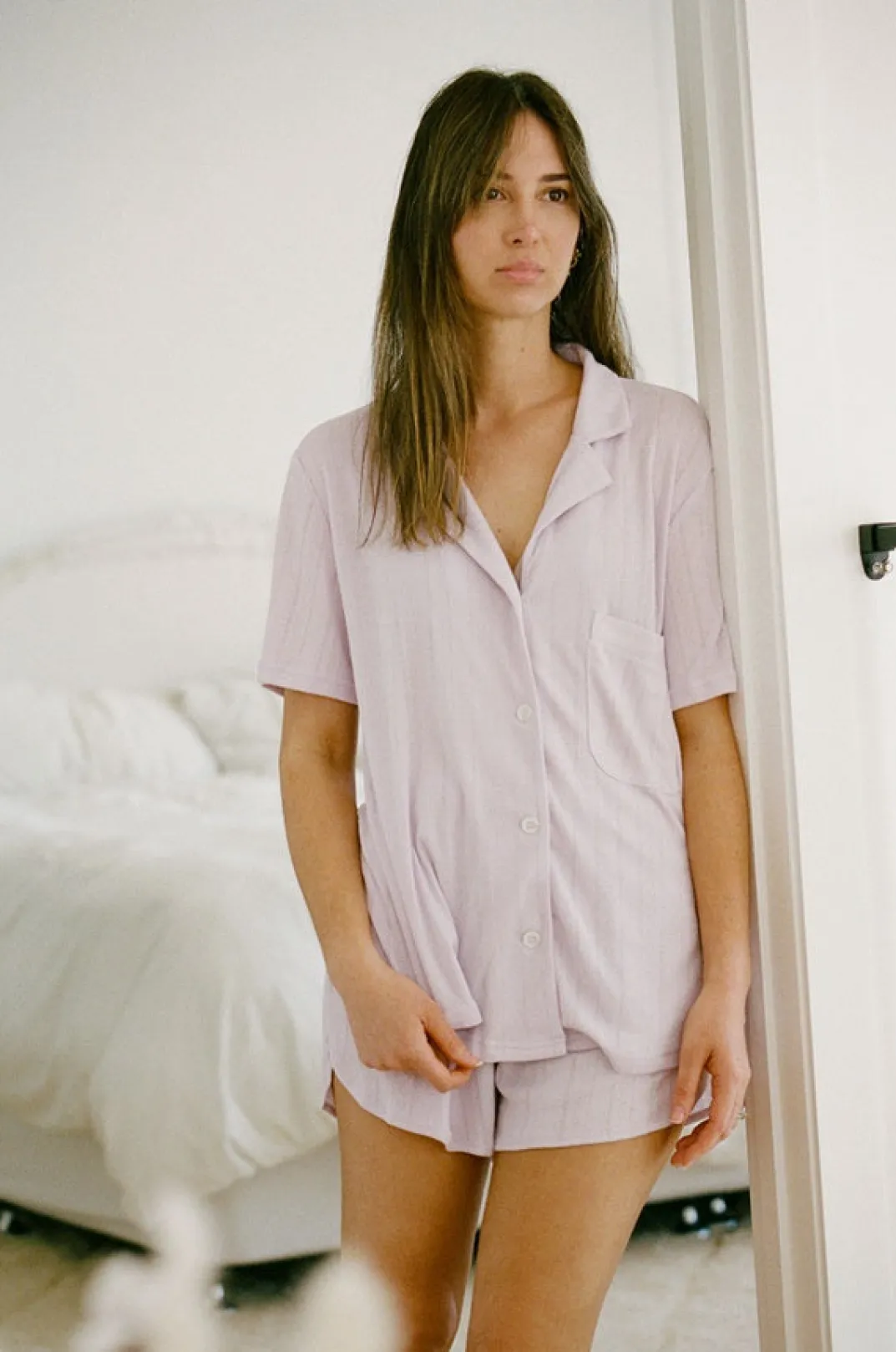 *This Is A Final Sale Item* Comfy And Super Cute! The Siesta Pj Top Is Made From A Super Soft Pointelle Jersey Fabric In A Soft Purple Hue. It Is A Relaxed Style Featuring Short Sleeves, Collar, Pocket At Left Breast, Curved Hem And Buttons Down Centre Front. Pair With The Siesta Pj Shorts And Lilac Jersey Scrunchie! Designed Exclusively By Sabo.