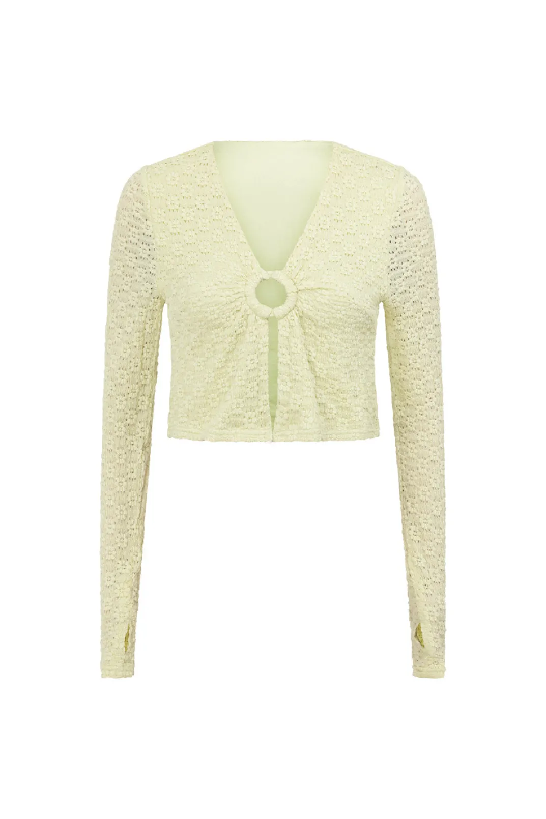The Trans Seasonal Sorbet Top Is Made From A Soft Flower Lace Fabric In A Soft Green Hue. It Is A Cropped Style Featuring Sheer Full Length Sleeves With Thumb Hole, V Neckline With Covered Ring Detail At Centre Bust And Split Detail At Centre Front. Get The Look With The Sorbet Midi Skirt! Designed Exclusively By Sabo.