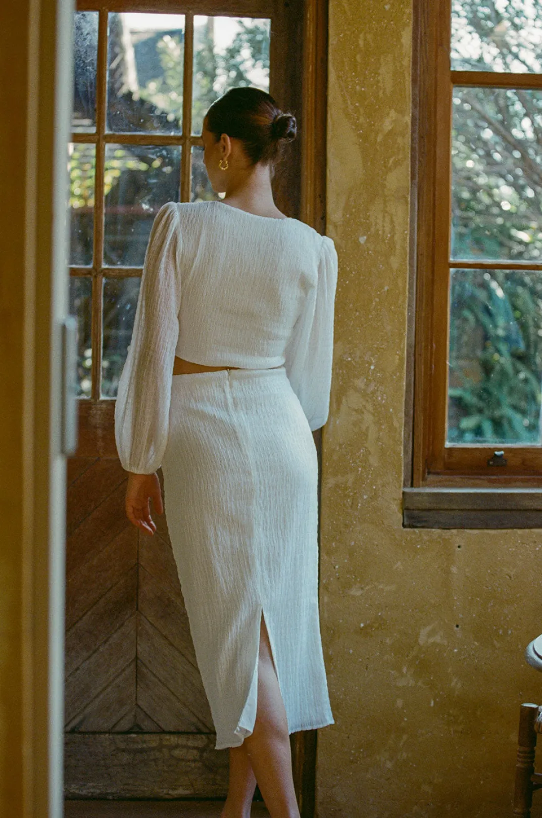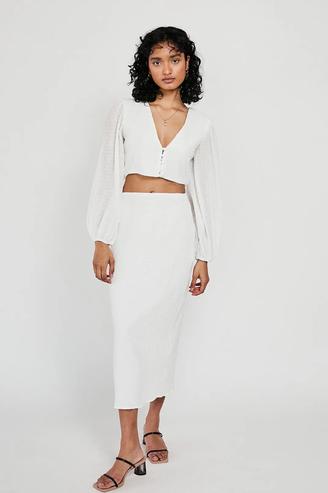 Wear It As A Set Or Style With Jeans! The Tasmin Top Is Made From A Textured Crepe Fabric In Off White. It Features Full Length Puff Sleeves, Plunging V Neckline And Covered Button Details At Centre Front. Get The Look With The Tasmin Skirt! Designed Exclusively By Sabo.