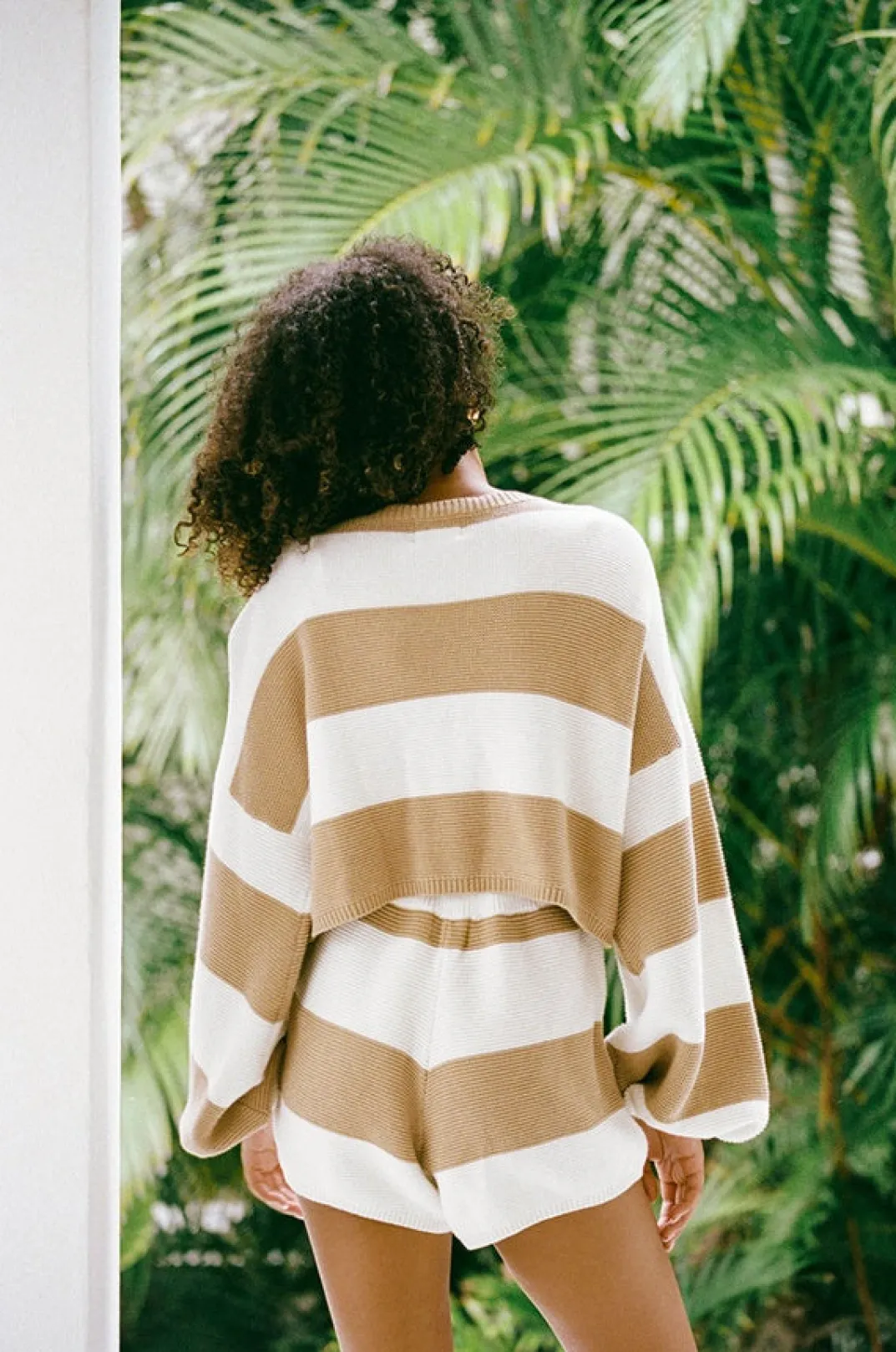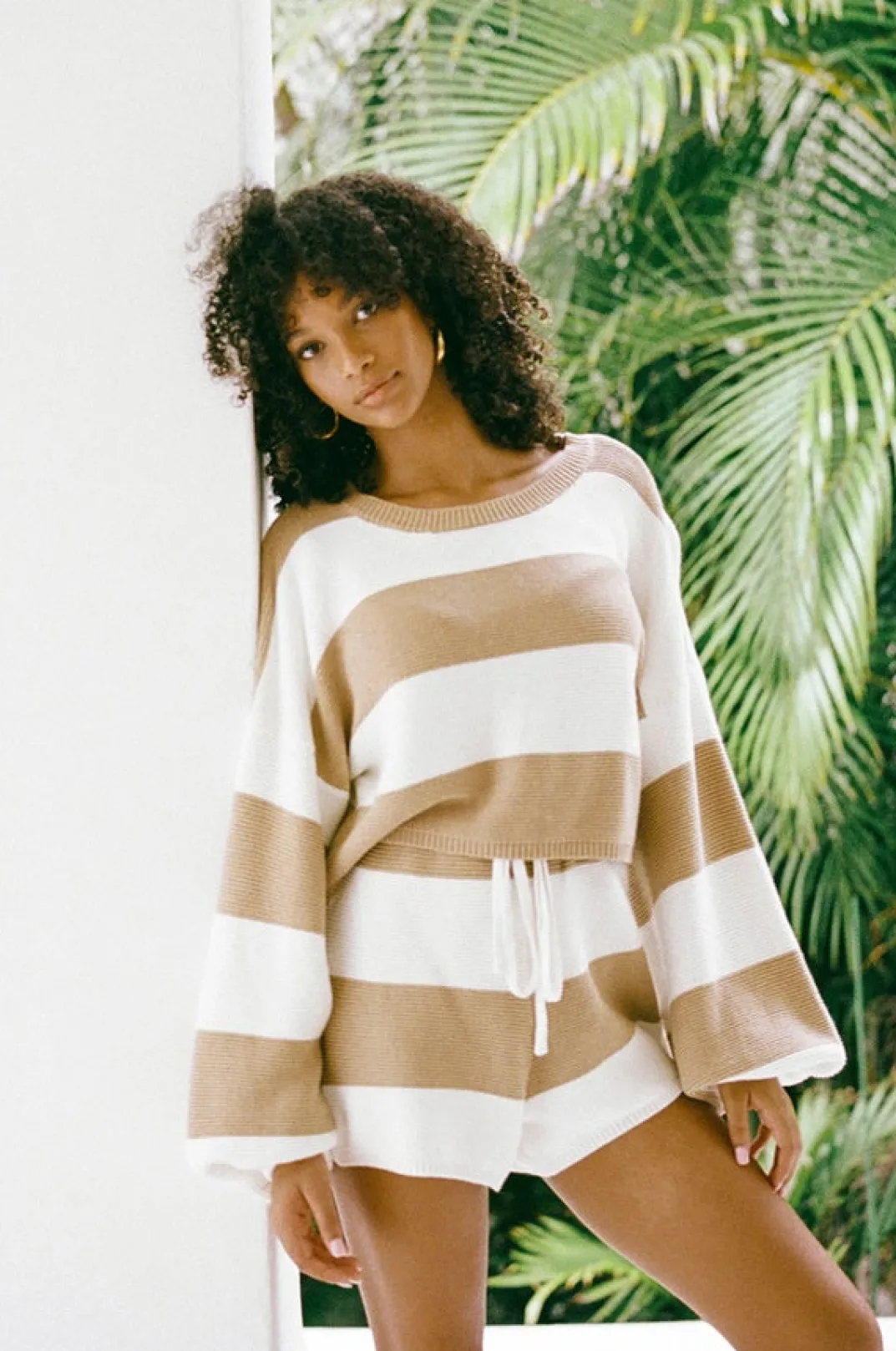 *This Is A Final Sale Item* Our Favourite Basic Shape With A Twist! The Teana Knit Shorts Are Made From A Natural Cotton Fabric In Off White And Tan Hues. They Are A High Waisted Style Featuring An Elasticated Waist With Drawstring And High-Low Hems. Get The Set And Pair With The Teana Knit Top! Designed Exclusively By Sabo.