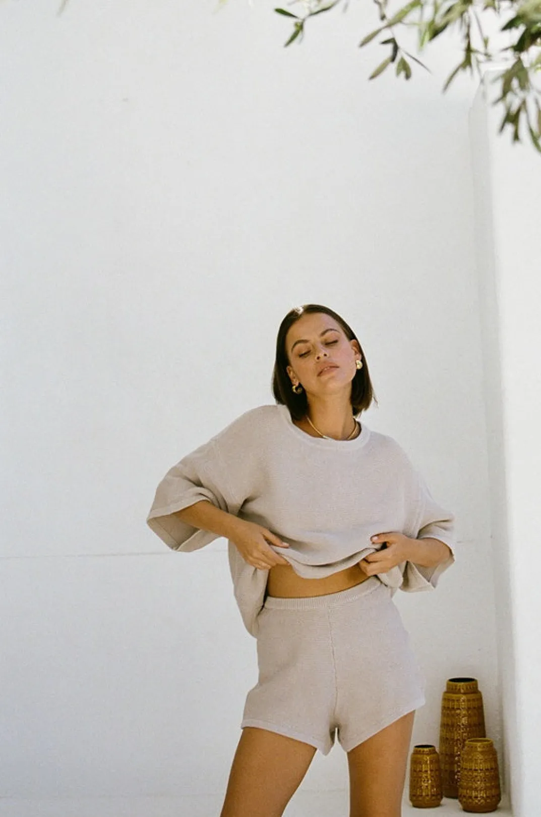 *This Is A Final Sale Item* Wear Them As A Set Or Style Them Your Way! The Telisa Shorts Are Made From A Natural Cotton Knit In A Tan Hue. They Are A High Waisted Style Featuring An Elasticated Waist, Contrast Ribbed Trims And High-Low Hems. Pair With The Telisa Top And Kamala Earrings! Exclusively Designed By Sabo.