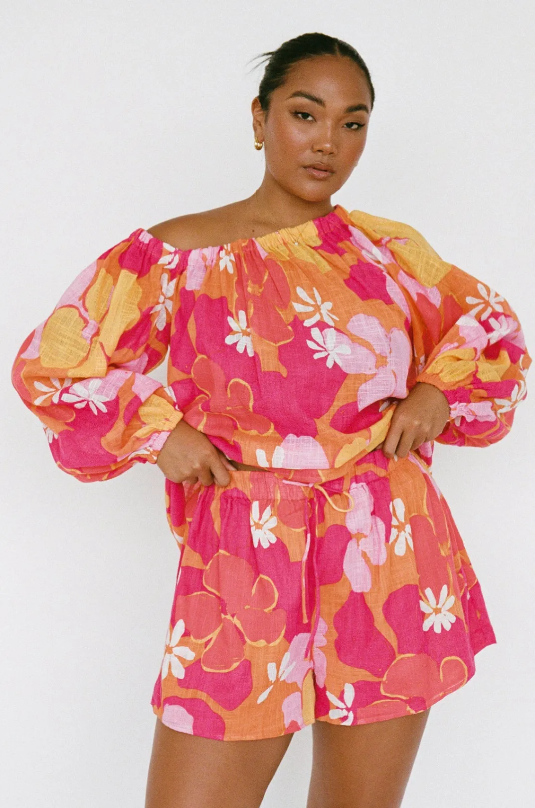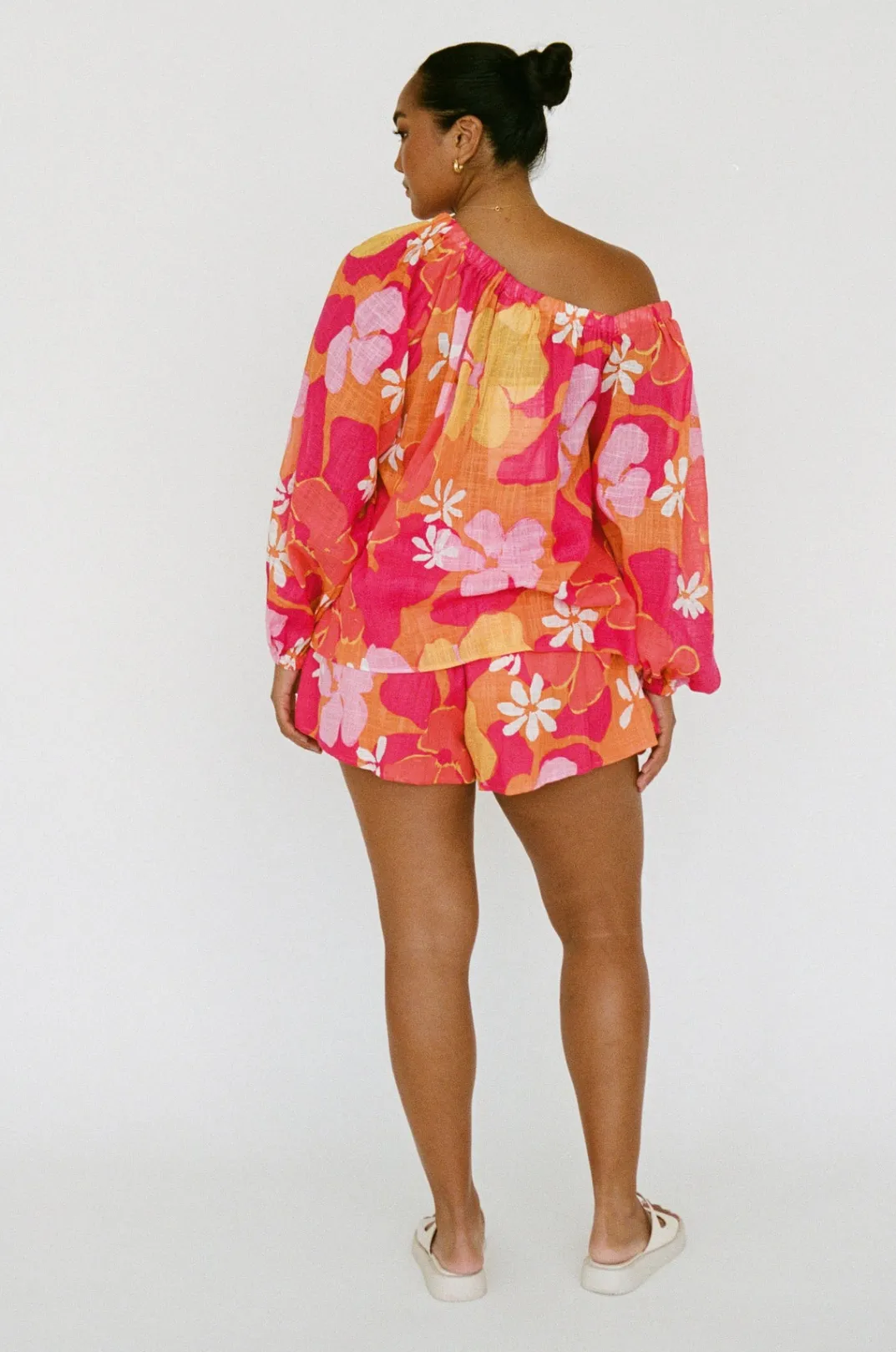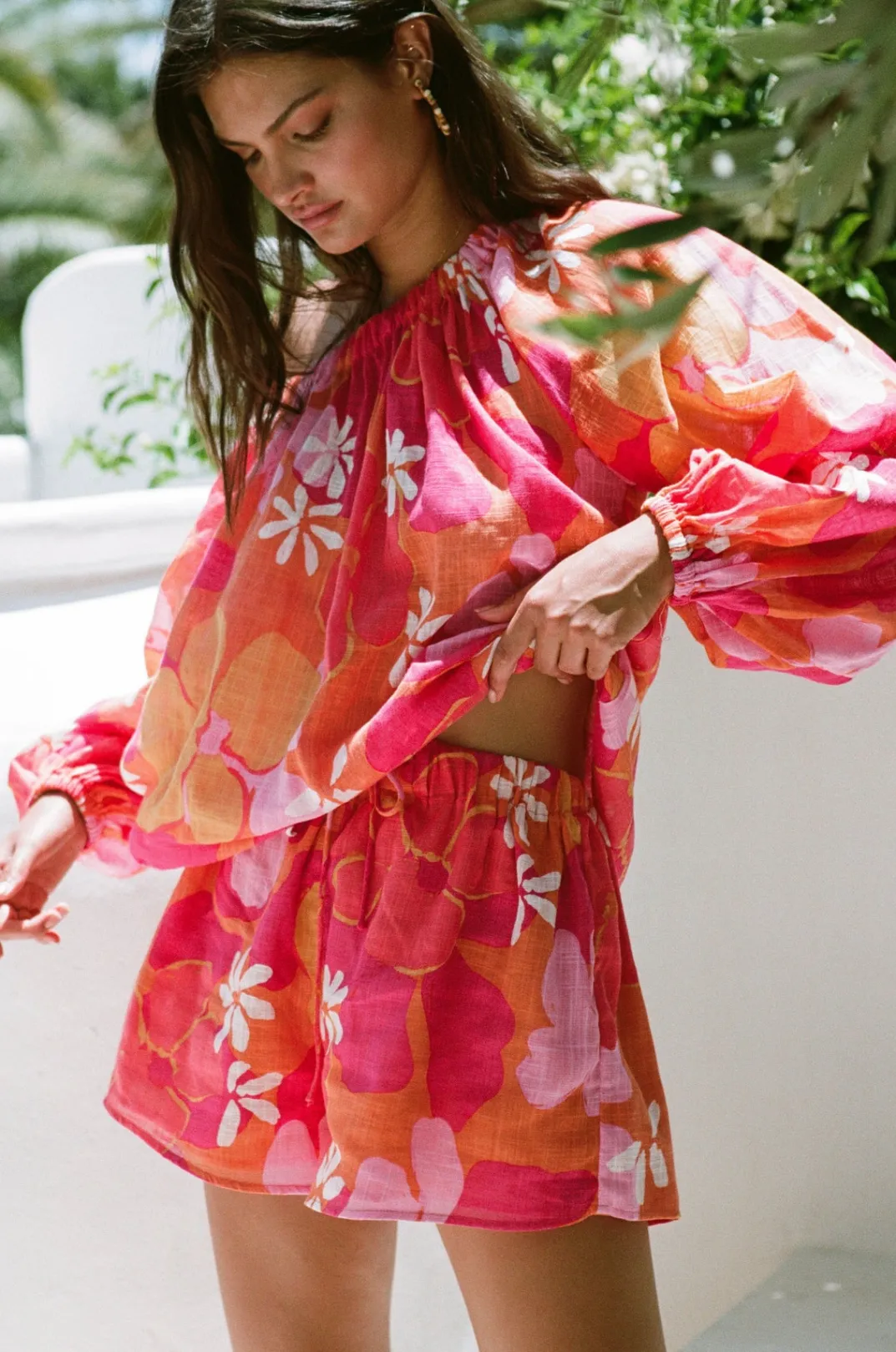 Add Some Spice To Your Life With Our New Exclusive Remi Sunset Print! The Tierra Top Is Made From A Stunning Natural Lightweight Cheesecloth Cotton Fabric And Features Full Length Puff Sleeves, Asymmetric Elastic Neckline And Relaxed Fit. Get The Look With The Tierra Shorts! Designed Exclusively By Sabo.