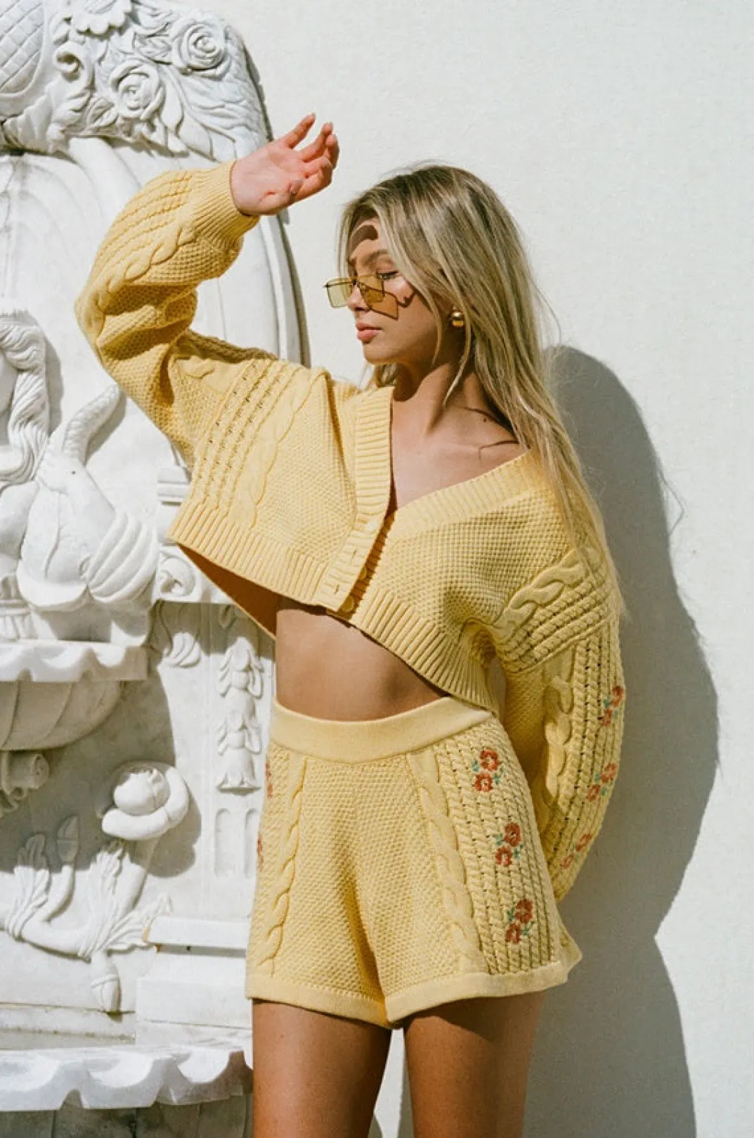 The Cutest Outfit To Transition Into The Cooler Months! The Zaine Knit Cardi Is Made From A Soft Cotton Blend Knit In A Vibrant Yellow Hue. It Is A Cropped Style Featuring A V Neckline With Buttons Down Centre Front, Cable Design At Sides And Sleeves And Embroidered Floral Detailing At Sleeves. Get The Look With The Zaine Knit Shorts! Designed Exclusively By Sabo.