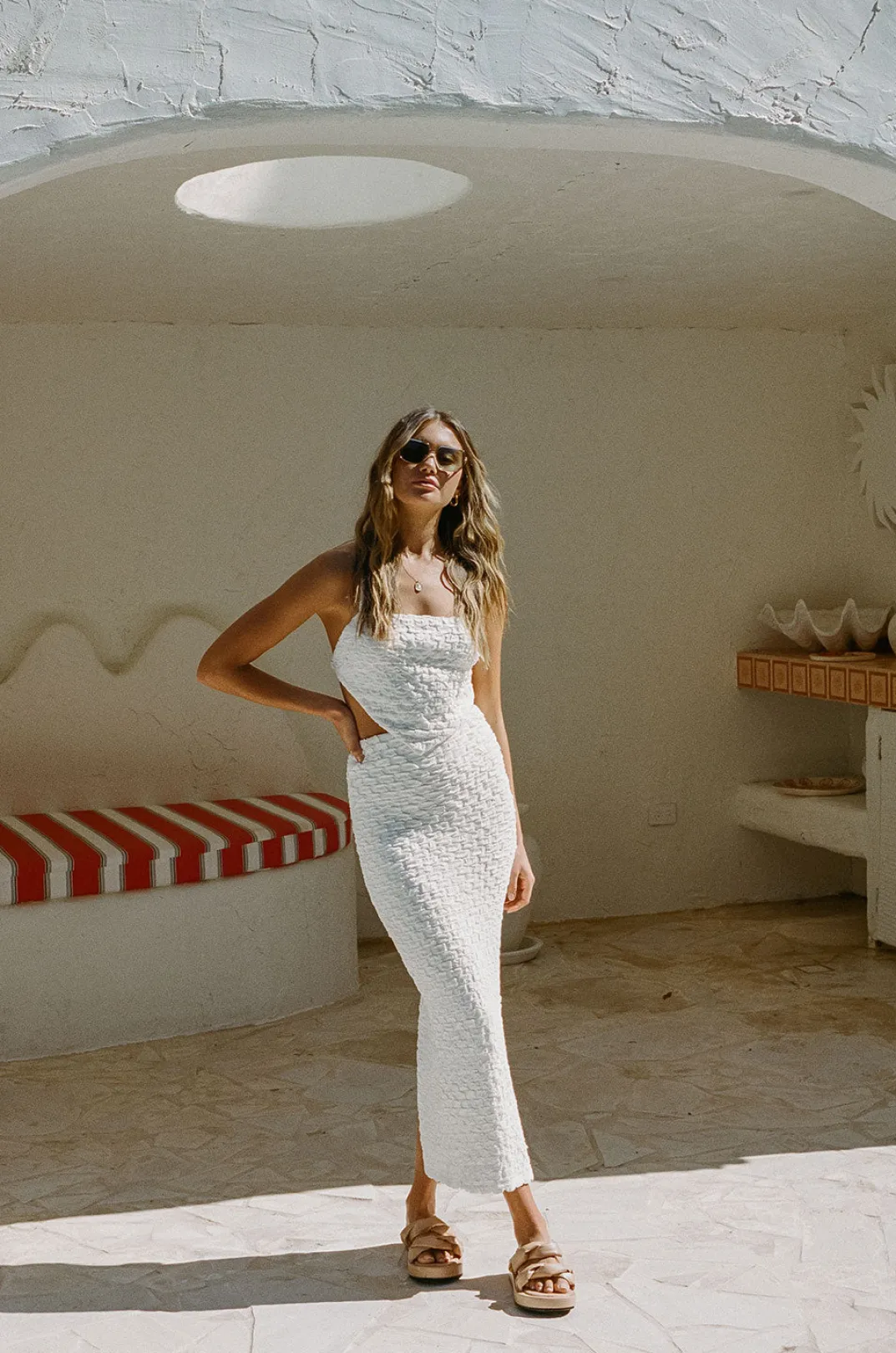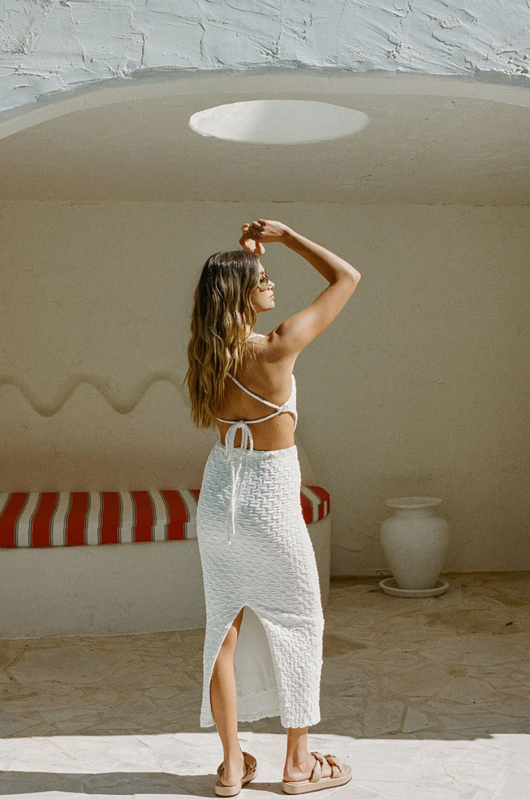 *This Is A Final Sale Item And Cannot Be Returned. See Our Returns Policy Here Obsessed With This Fabric! The Zantina Maxi Skirt Is Made From A Textured Bubble Cotton Blend Fabric In An Off White Hue. It Is A High Waisted Fitted Style With A Centre Back Split. Get The Set And Pair With The Backless Wren Top! Designed Exclusively By Sabo.