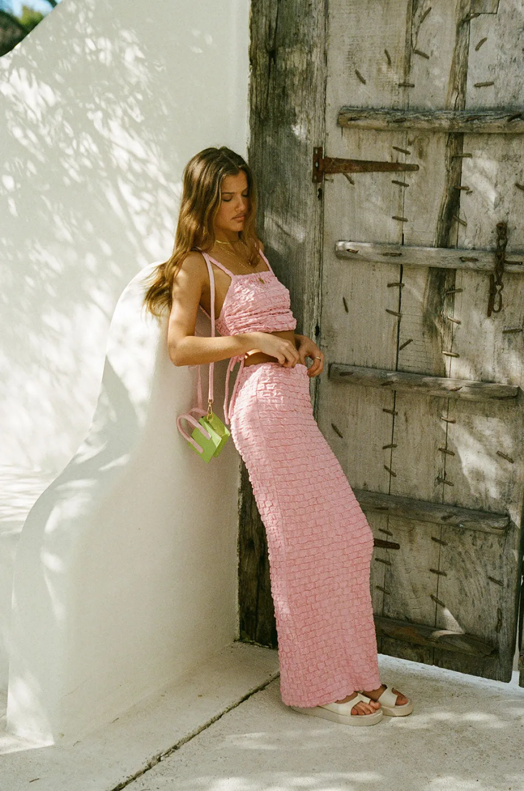 A Flattering Shape In A Fun Fabric! The Zendaya Skirt Is Made From A Textured Bubble Cotton Blend Fabric In A Pink Hue. It Is A High Waisted Maxi Style Featuring A Centre Back Split. Get The Look With The Zendaya Top And Strappy Asteria Heels! Designed Exclusively By Sabo.