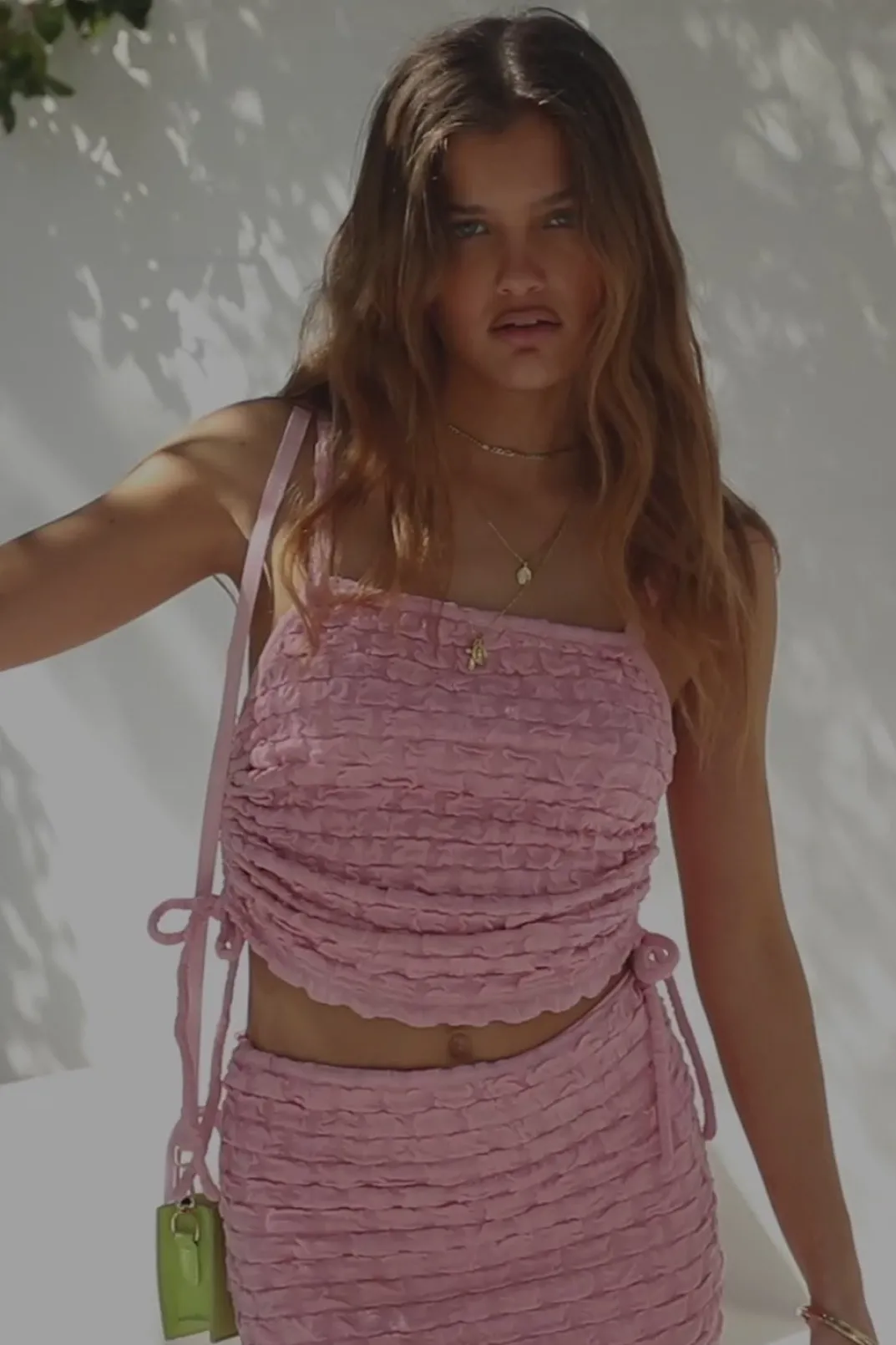 Wear It As A Set Or Pair It Back With Denim Bottoms! The Zendaya Top Is Made From A Textured Bubble Fabric In A Pink Hue. It Features Thin Straps And Draw Details At Sides. Get The Set With The Zendaya Skirt! Designed Exclusively By Sabo.