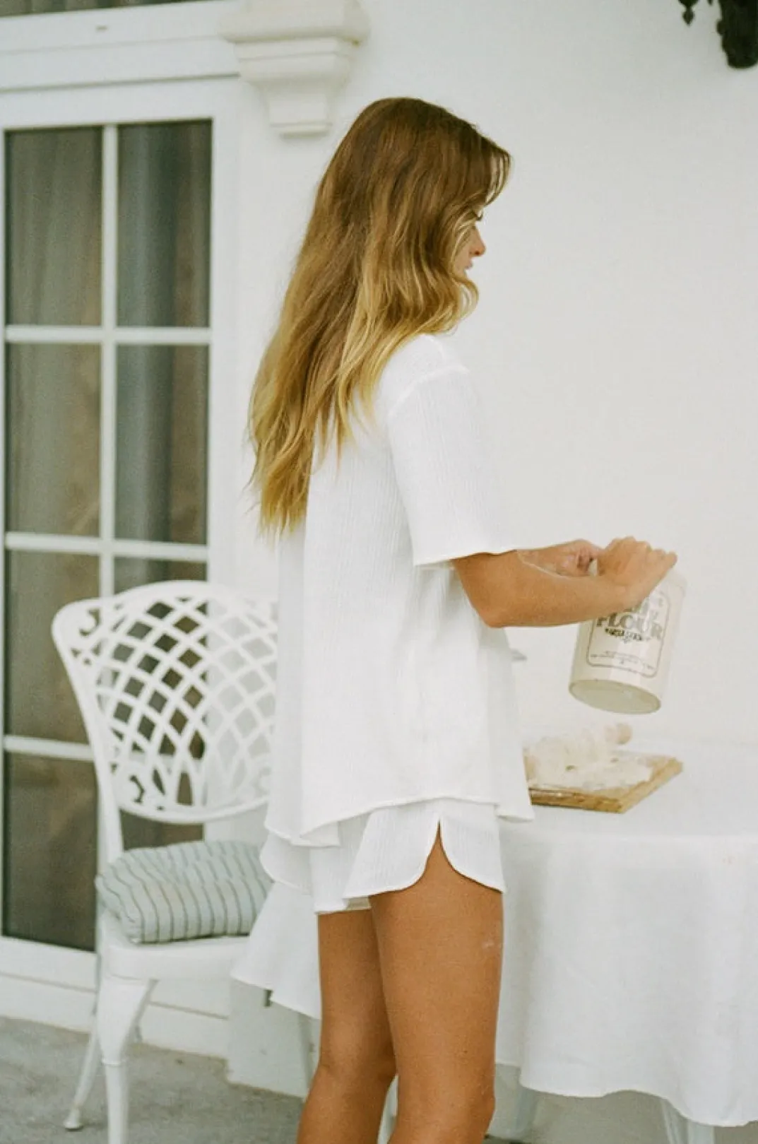 *This Is A Final Sale Item* Comfy And Super Cute! The Siesta Pj Top Is Made From A Textured Woven Fabric In A Light Cream Hue. It Is A Relaxed Style Featuring Short Sleeves, Collar, Pocket At Left Breast, Curved Hem And Buttons Down Centre Front. Pair With The Siesta Pj Shorts And Fluffy Slippers! Exclusively Designed By Sabo.