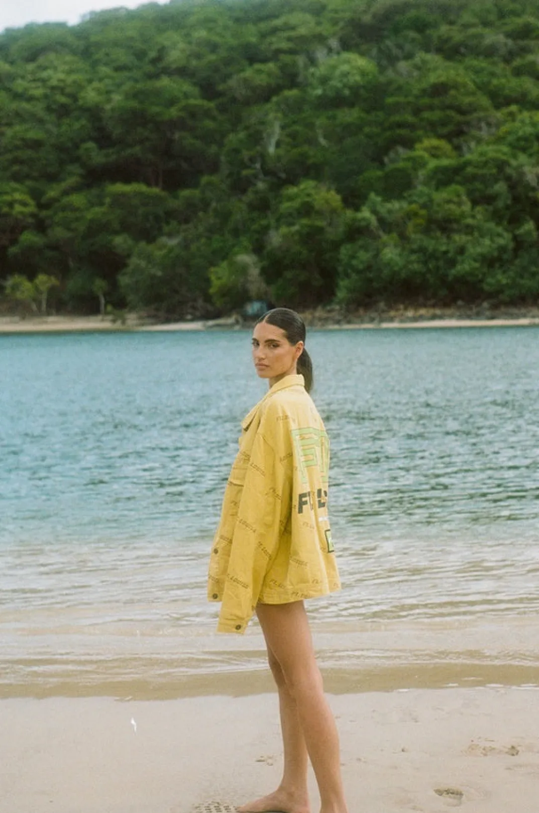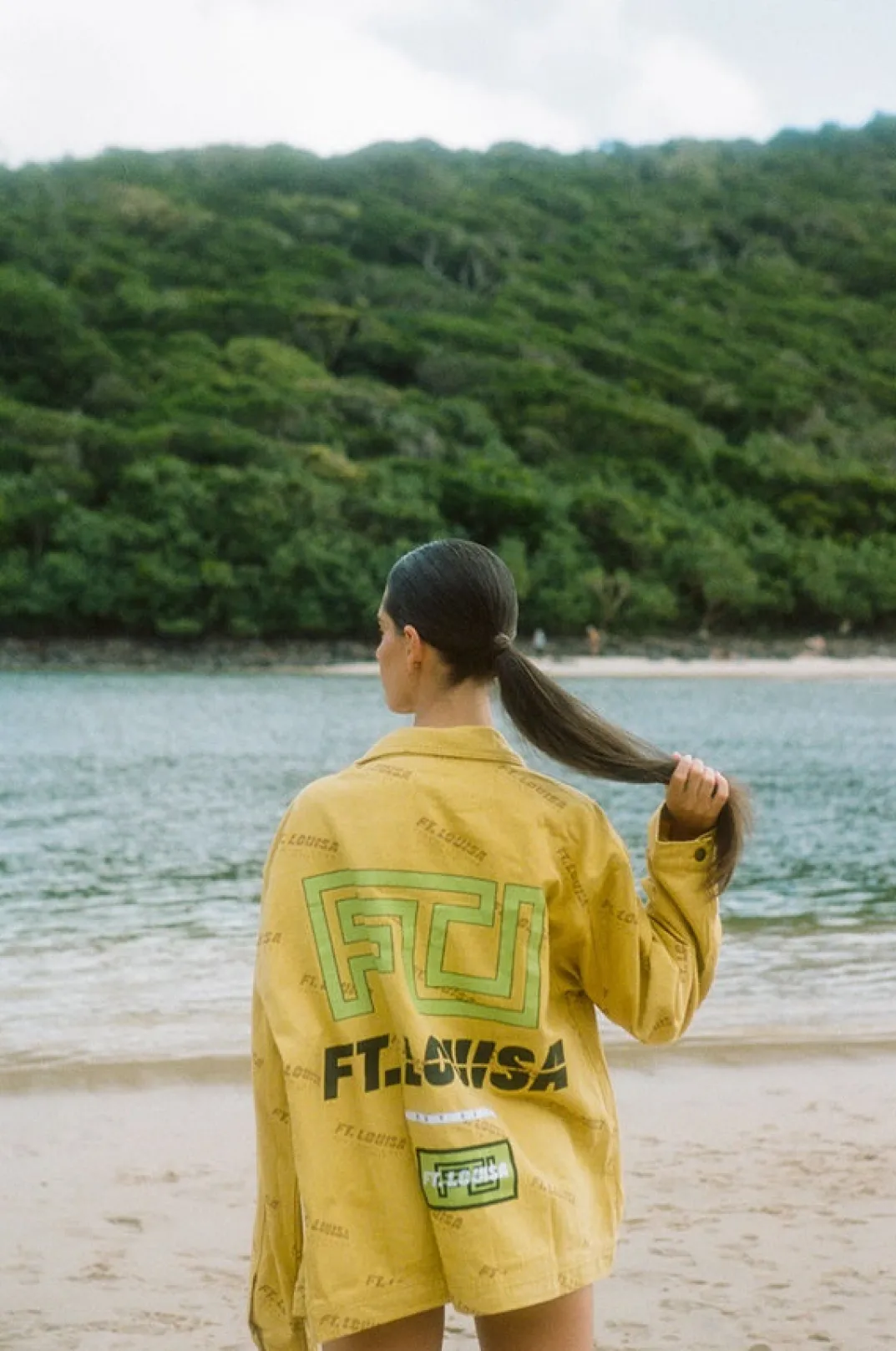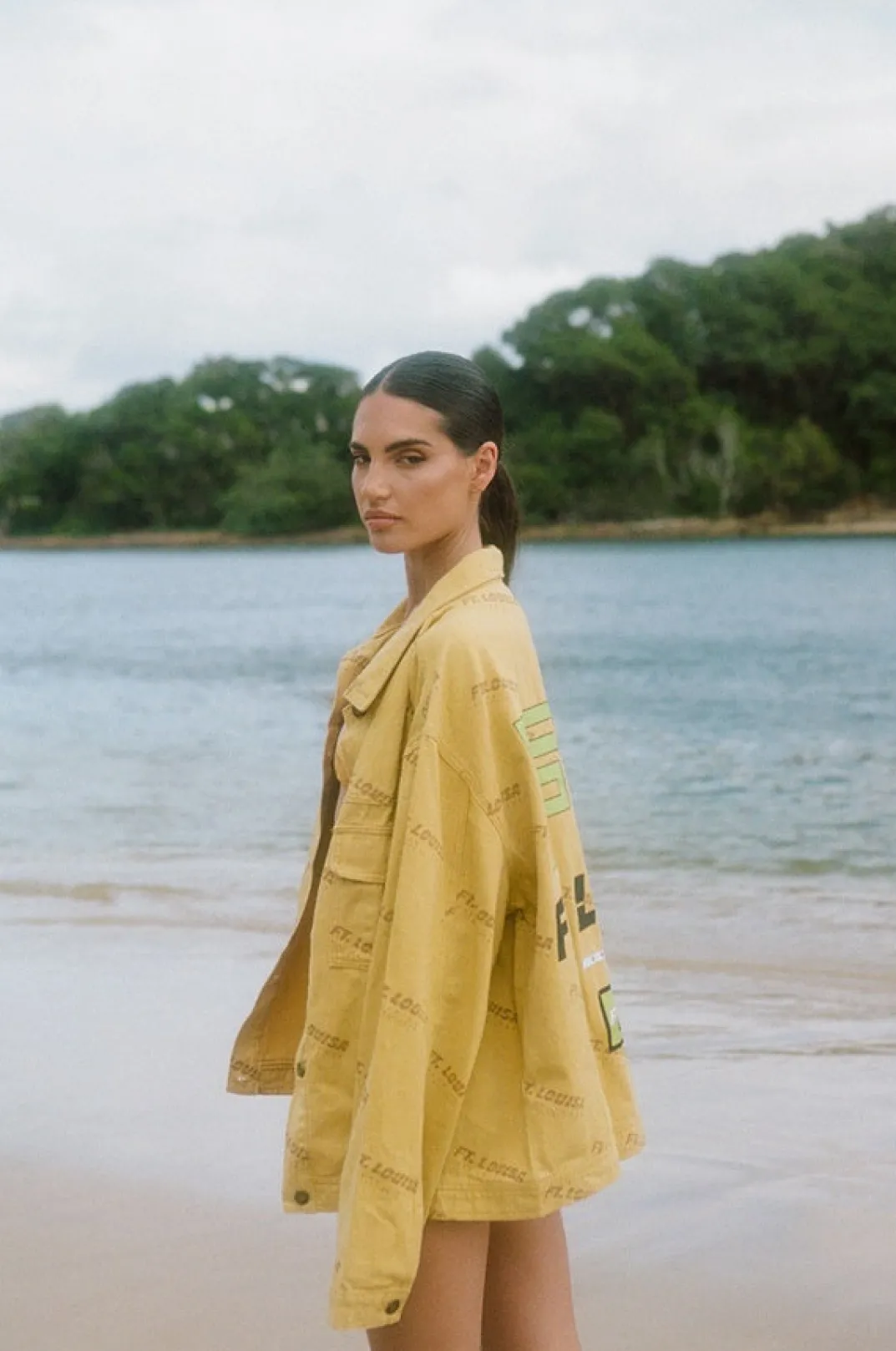 *This Is A Final Sale Item* The Era Denim Jacket Is A Unisex Style Made From A Thick Cotton Mustard Denim With Brown Signature Ft. Louisa Throughout. It Is An Oversized Style Featuring Patch And Green And Black Printed Detailing At Back. By Ft. Louisa.