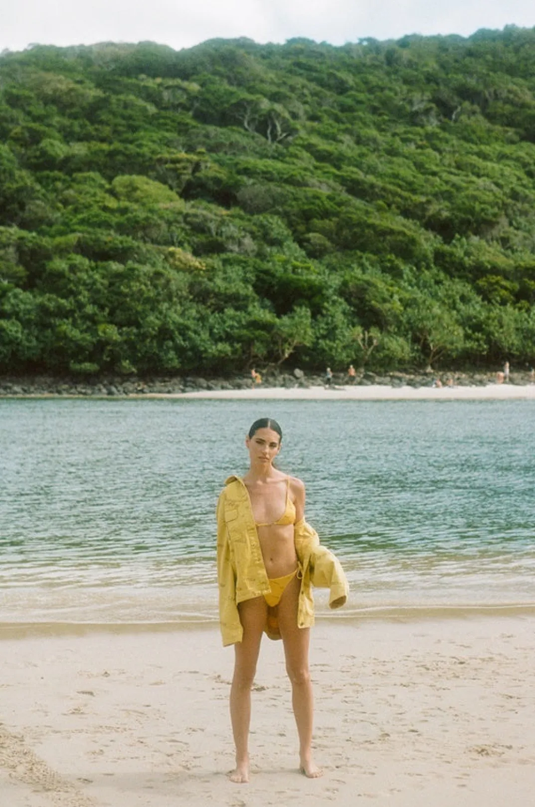 *This Is A Final Sale Item* The Era Denim Jacket Is A Unisex Style Made From A Thick Cotton Mustard Denim With Brown Sig…