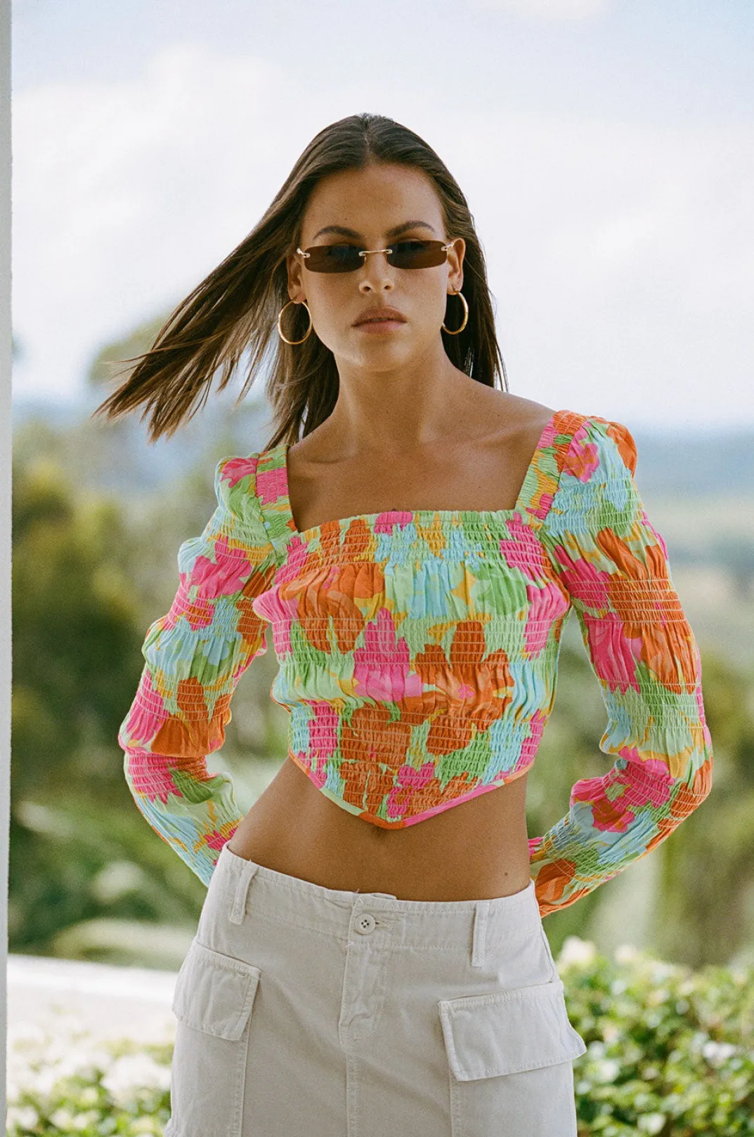 A Bold Way Style Your Bottoms And Turn Heads! The Juliet Shirred Top Is Made From A Zipper Crepe Fabric With Our New Exclusive Green Pacific Floral Print. It Features A Square Neckline Full Length Sleeves, Curved Hem And Shirred Panels Throughout. Style With A Neutral Skirt And Pair Of Heels For A Late Lunch With The Girls! Designed Exclusively By Sabo.
