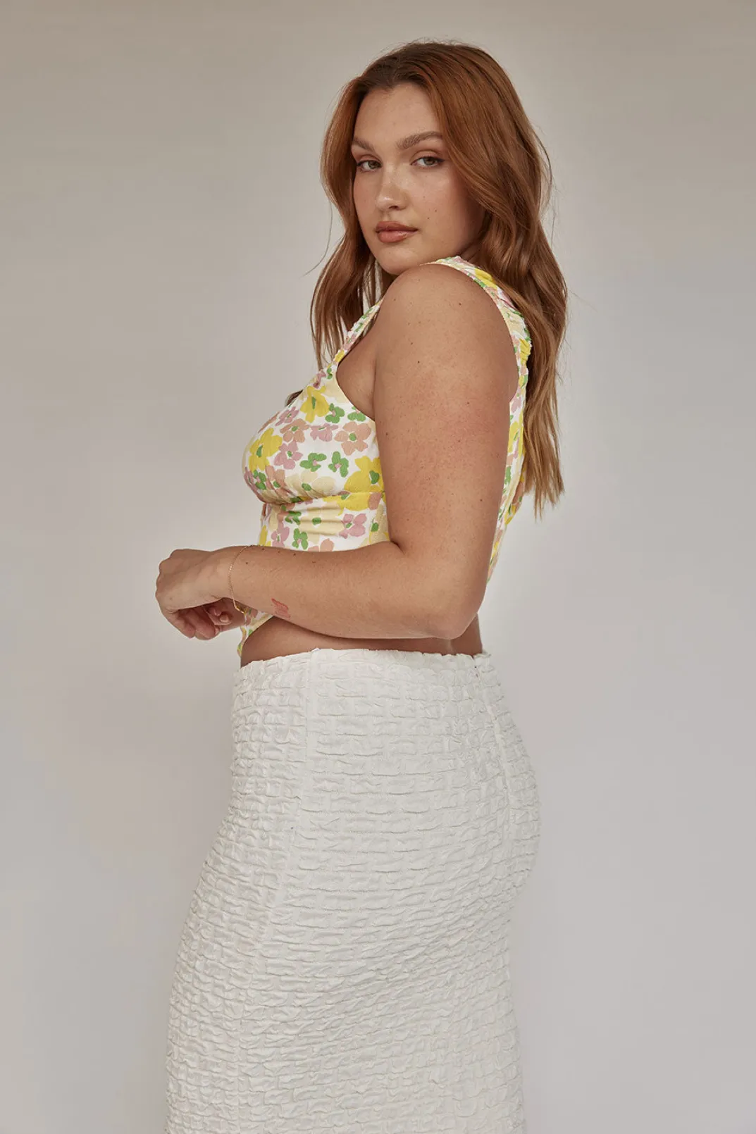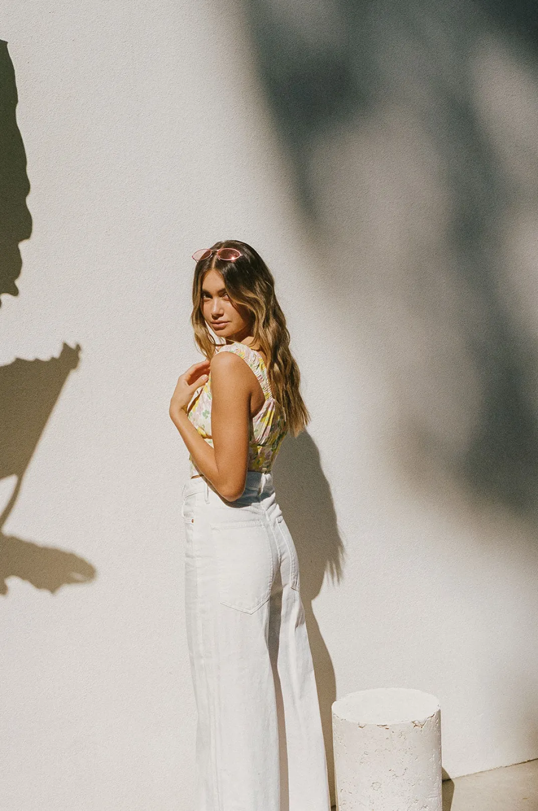 Designed To Flatter! The Leighton Corset Top Is Made From A Viscose Crepe Fabric With Our Exclusive Primrose Floral Print. It Features Cute Cap Sleeves, Draw Tie At Centre Neckline, Boned Corset Waist With Gold Hook Eye Details And An Asymmetric Hemline. The Perfect Pair To Your Favourite Jeans! Designed Exclusively By Sabo.
